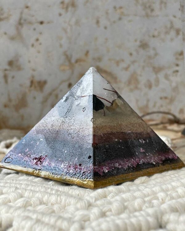 Our pyramids are organically poured to order and can vary in color and material distribution based on how the resin settles. There may be slight imperfections and discrepancies in the piece you receive. (i.e bubbles, bare spots, bumps, and small pockets) These discrepancies will not affect the function of the orgonite.
