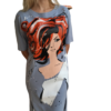 Irregular double color linen shirt with a drawing of a half-face girl oriented with multiple diamonds